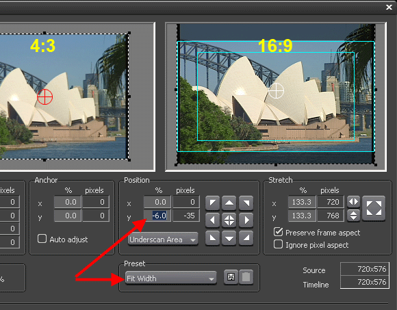 A common use of the layout tool could be to scale 4:3 clips to 16:9. In such a case, select fit to width from Preset dropdown, then adjust vertical position so no heads are cut off etc. You will need to apply a sharpness filter with around 12% to compensate for the loss of sharpness caused by the 4:3 to 16:9 upscaling.
